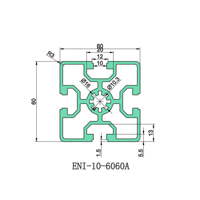 E&I-10-6060A is a T-slot aluminum profile with a slot width of 10mm and a specification of 60mm×60mm. It is specially designed for industrial equipment frames and automated production lines, and has excellent load-bearing capacity and fatigue resistance. It is made of high-strength aluminum alloy material, and the surface is anodized to provide excellent corrosion resistance and rust resistance, so that it can still maintain excellent condition in humid or high temperature environments.